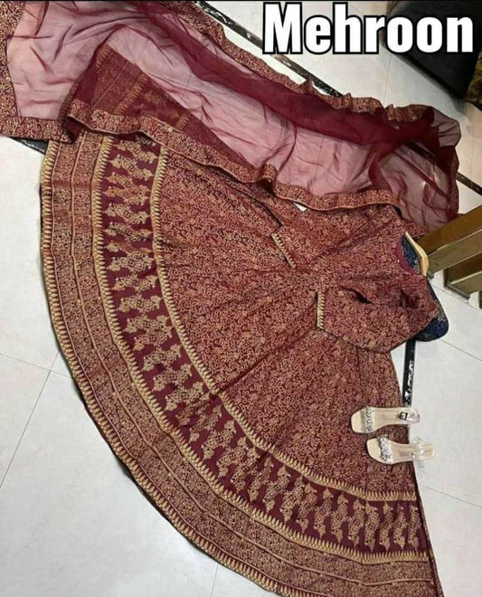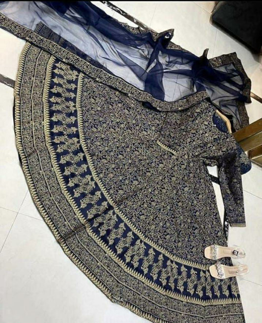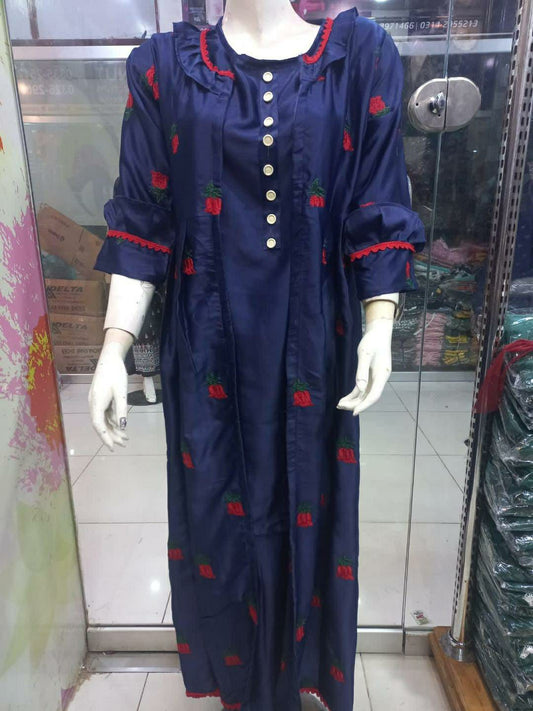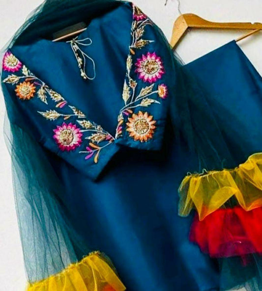 3 Pcs Women's Stitched Silk Embroidered Gown Suit (Blue)