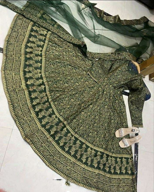 3 Pcs Women's Stitched Katan Silk steam Print Suit (Green)