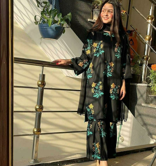 3 Pcs Women's Stitched Linen Printed Suit (Black)