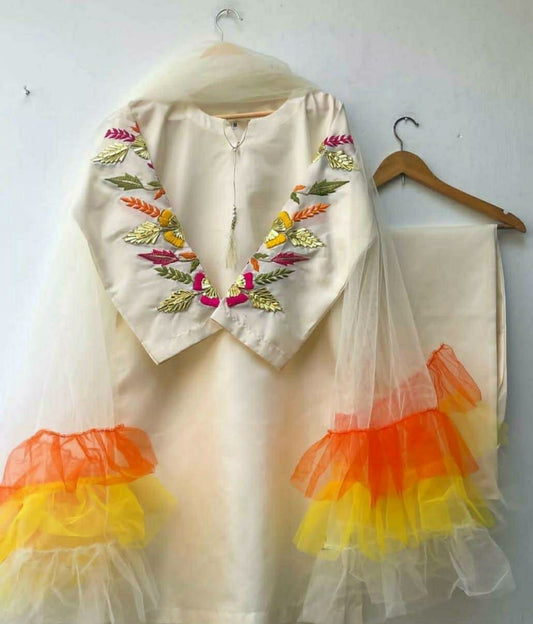 Kattan Silk Stitched 3pcs Embroidered Suit (Off White)