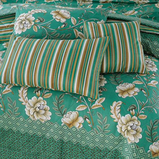 7 Pcs Cotton Salonica Printed Comforter Set (Green,Golden Design)