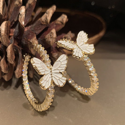 Three-dimensional Micro Inlaid Zircon Fashionable White Butterfly Earrings