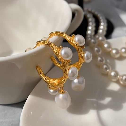 Silver Needle Irregular Oval Geometric Pearl Stud Earrings