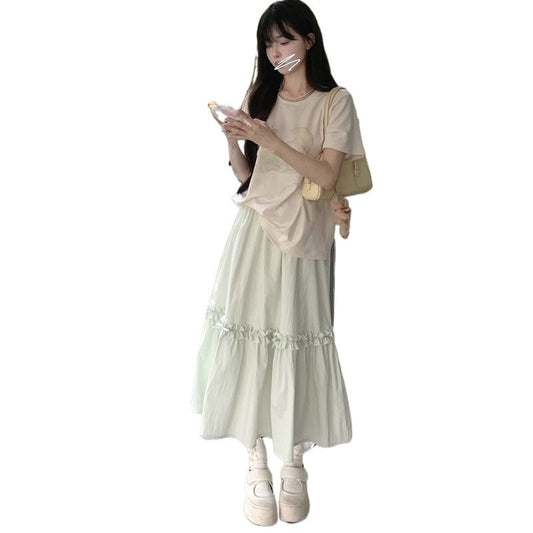 Elastic Waist Mid-length Vanilla Green A- Line Skirt