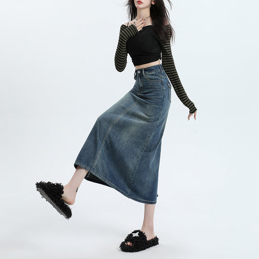 Mid-length Blue Denim Retro Urban Leisure One-Step Solid Skirt
