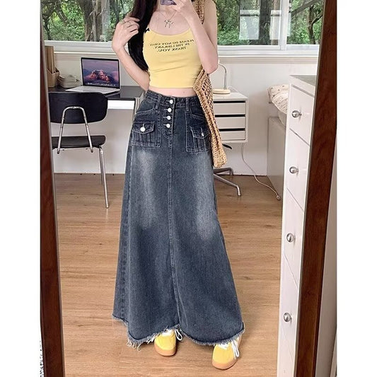 Autumn High Waist Retro Straight Loose Long Denim Skirt For Women